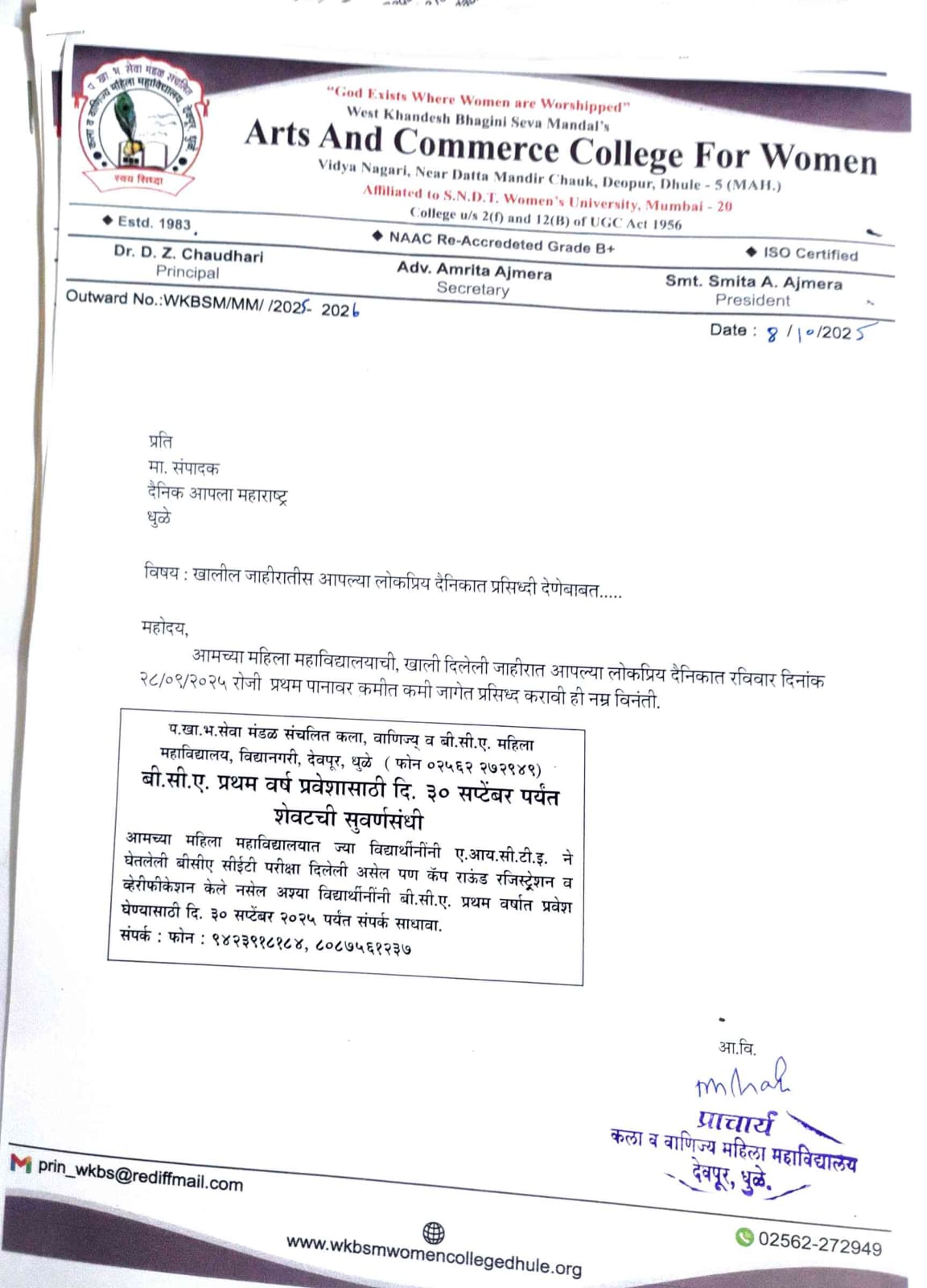 West Khandesh Bhagini Seva Mandal was established on 21st December 1956. It has been striving held in rendering the educational services to the community since last 52 years by keeping in view the integral objectives of providing useful and need-solving education to women and children and bringing their social, economic and cultural upliftment.